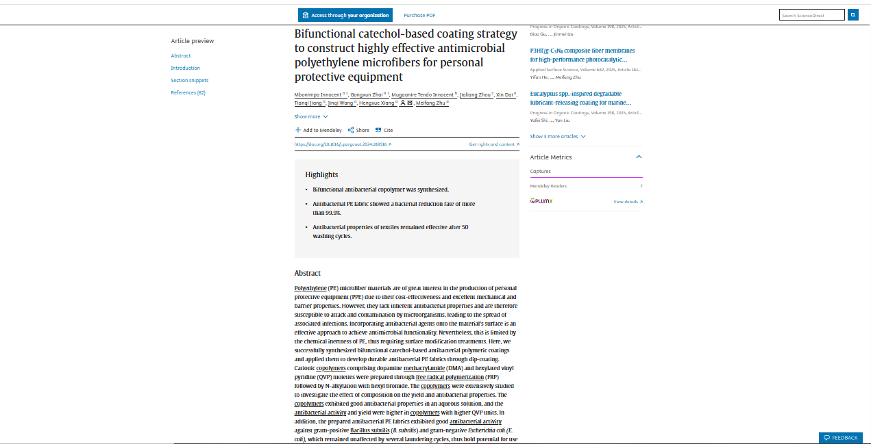 Innocent, M., Zhai, G., Innocent, M. T., Zhou, J., Dai, X., Jiang, T., ... & Zhu, M. (2025). Bifunctional catechol-based coating strategy to construct highly effective antimicrobial polyethylene microfibers for personal protective equipment. Progress in Organic Coatings, 198, 108916.