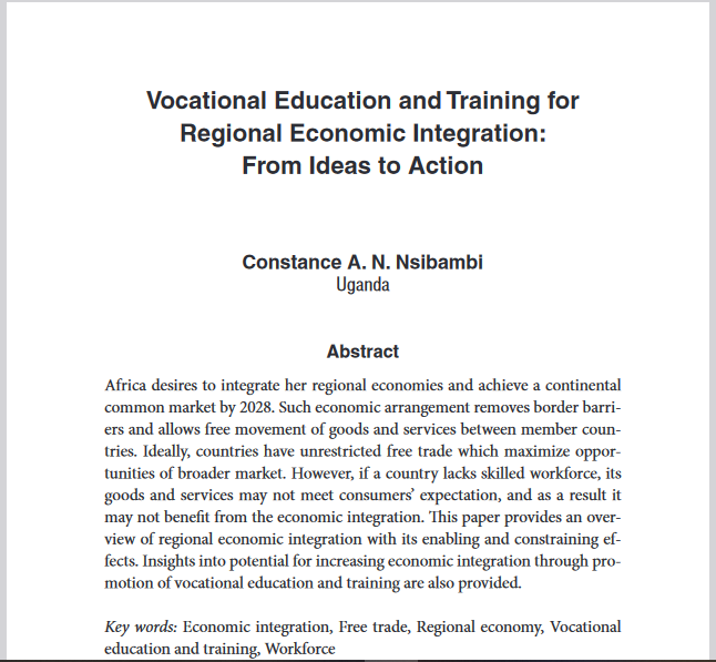 Nsibambi, C. A. (2014). Vocational Education and Training for Regional Economic Integration: From Ideas to Action. International Journal of Vocational Education and Training Volume, 22, 16-25.