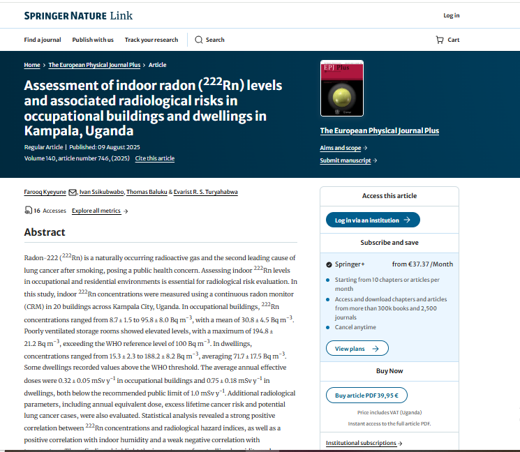 Kyeyune, F., Ssikubwabo, I., Baluku, T., & Turyahabwa, E. R. (2025). Assessment of indoor radon (222Rn) levels and associated radiological risks in occupational buildings and dwellings in Kampala, Uganda. The European Physical Journal Plus, 140(8), 1-12.