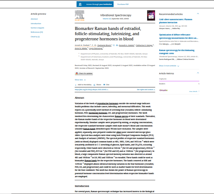 Ondieki, A. M., Birech, Z., Kaduki, K. A., Kaingu, C. K., Ndeke, A. N., & Namanya, L. (2022). Biomarker Raman bands of estradiol, follicle-stimulating, luteinizing, and progesterone hormones in blood. Vibrational Spectroscopy, 122, 103425.