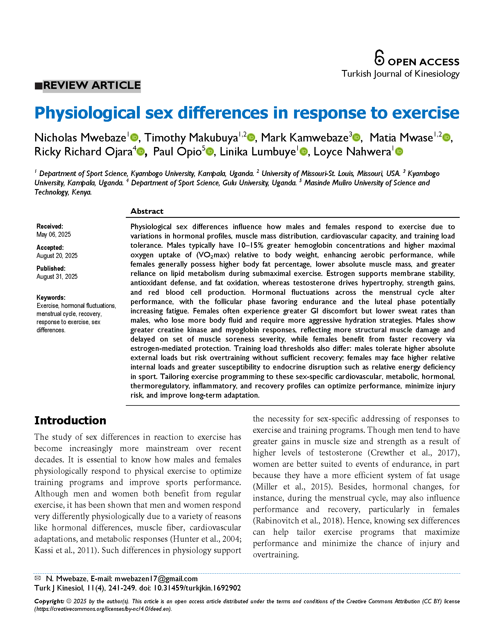 Mwebaze, N., Makubuya, T., Kamwebaze, M., Mwase, M., Ojara, R. R., Opio, P., ... & Nahwera, L. (2025). Physiological sex differences in response to exercise. Turkish Journal of Kinesiology, 11(4), 241-249.