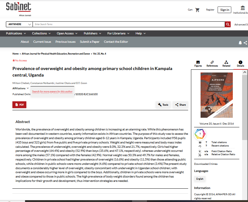 Chebet, M., Nsibambi, C., Otala, J., & Goon, D. T. (2014). Prevalence of overweight and obesity among primary school children in Kampala central, Uganda. African Journal for Physical Health Education, Recreation and Dance, 20(4), 1365-1378.