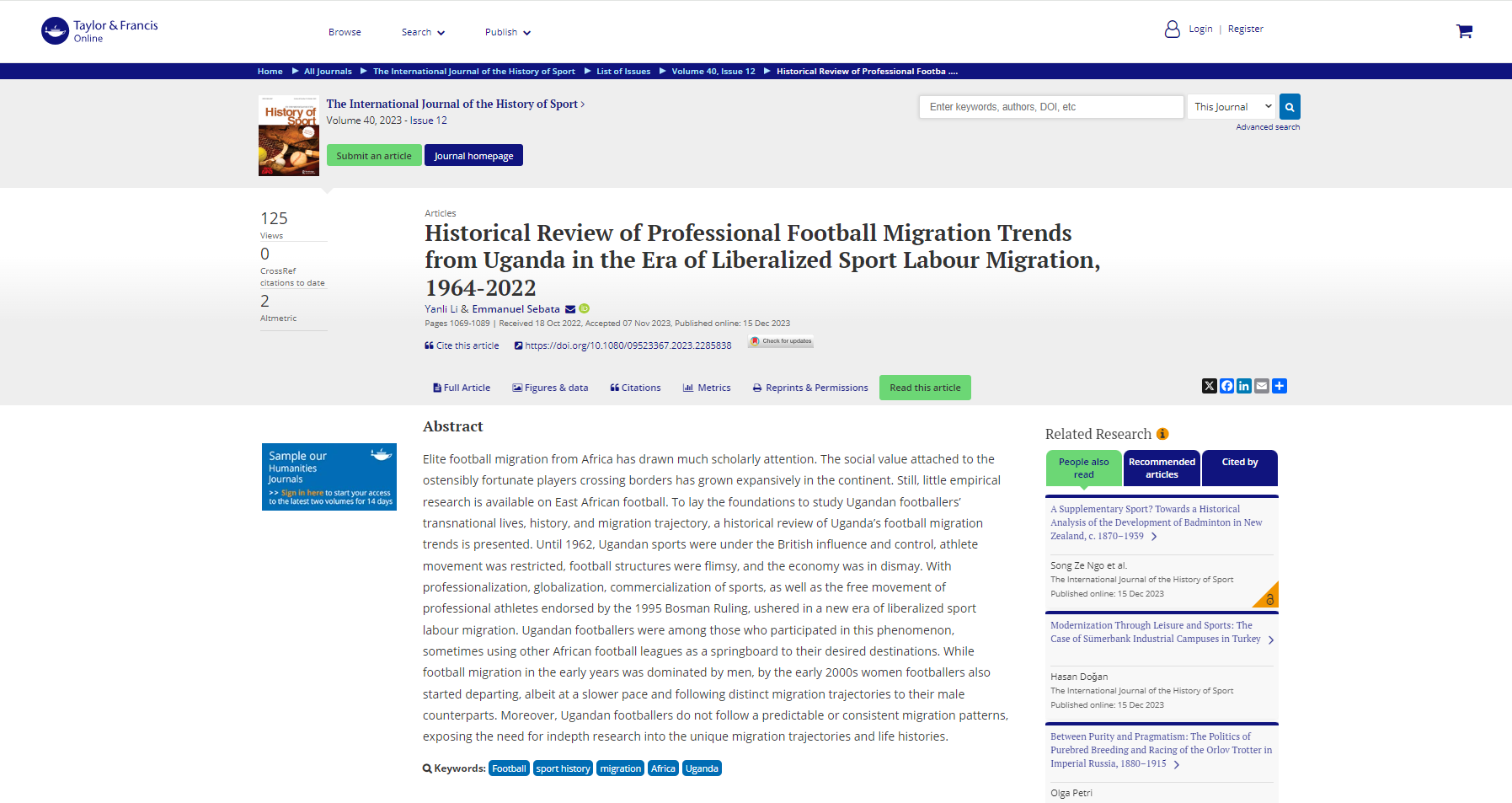 Li, Y., & Sebata, E. (2023). Historical Review of Professional Football Migration Trends from Uganda in the Era of Liberalized Sport Labour Migration, 1964-2022. The International Journal of the History of Sport, 40(12), 1069–1089. https://doi.org/10.1080/09523367.2023.2285838