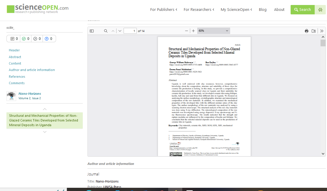 Mukwaya, G. W., Enjiku, B., & Mukhokosi, E. P. (2023). Structural and Mechanical Properties of Non-Glazed Ceramic Tiles Developed from Selected Mineral Deposits in Uganda. Nano-Horizons: Journal of Nanosciences and Nanotechnologies, 2, 14-pages.