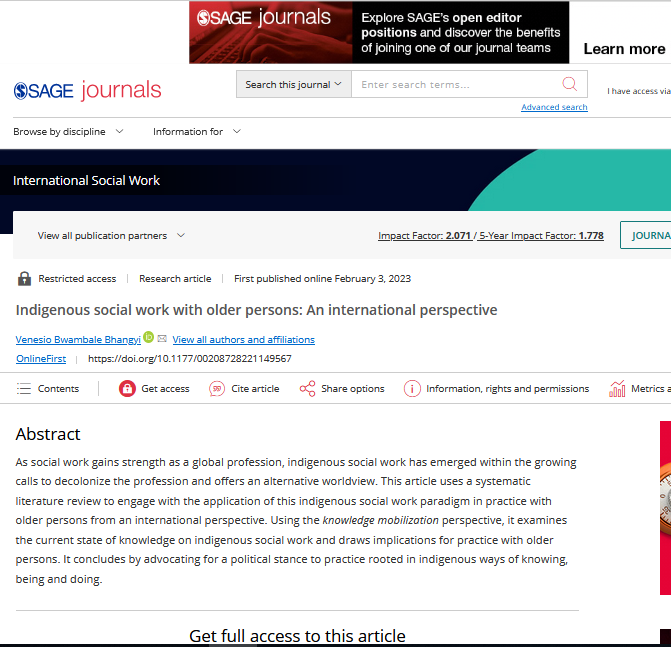 Bhangyi, V. B. (2023). Indigenous social work with older persons: An international perspective. International Social Work, 0(0). https://doi.org/10.1177/00208728221149567