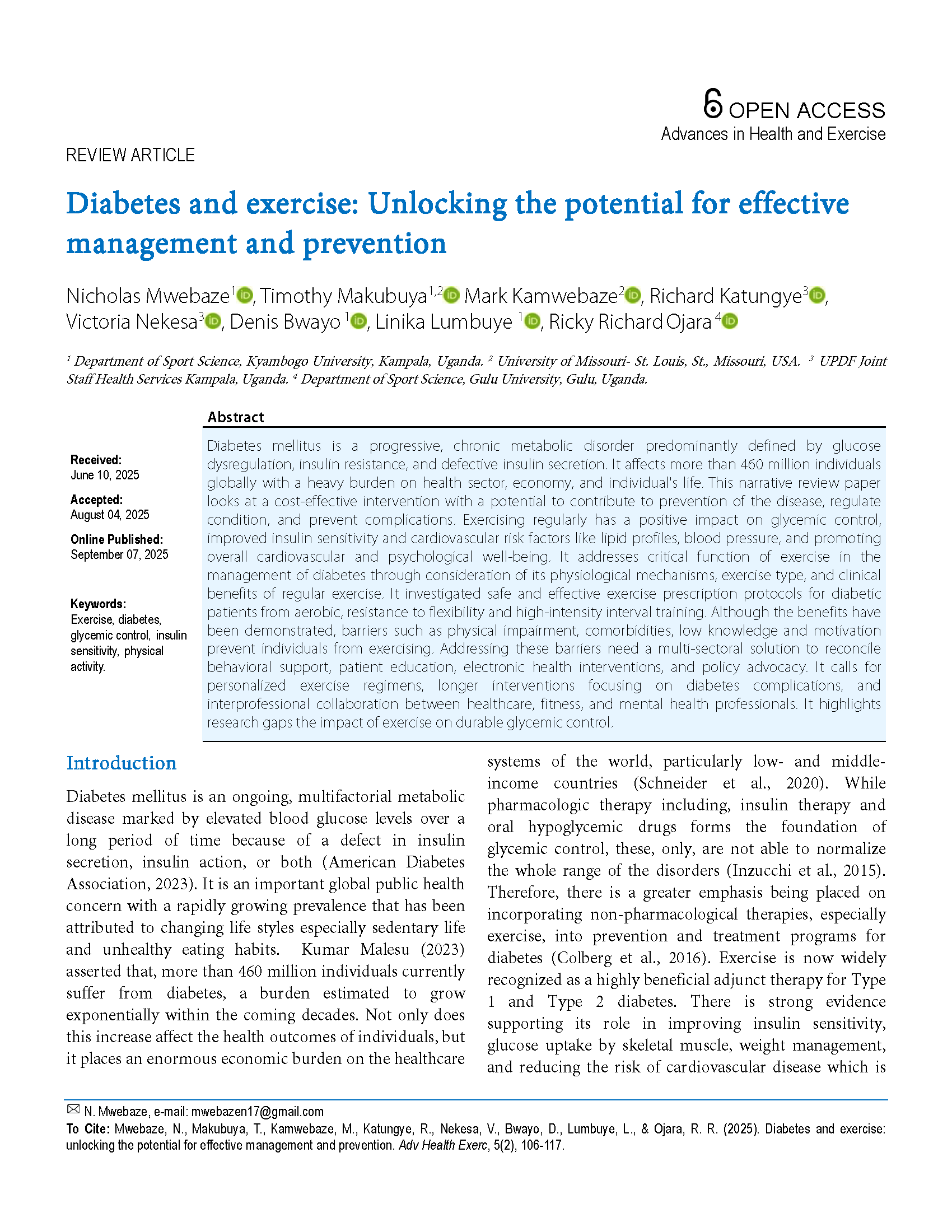 Mwebaze, N., Makubuya, T., Kamwebaze, M., Katungye, R., Nekesa, V., Bwayo, D., ... & Ojara, R. R. (2025). Diabetes and exercise: Unlocking the potential for effective management and prevention. Advances in Health and Exercise, 5(2), 106-117.