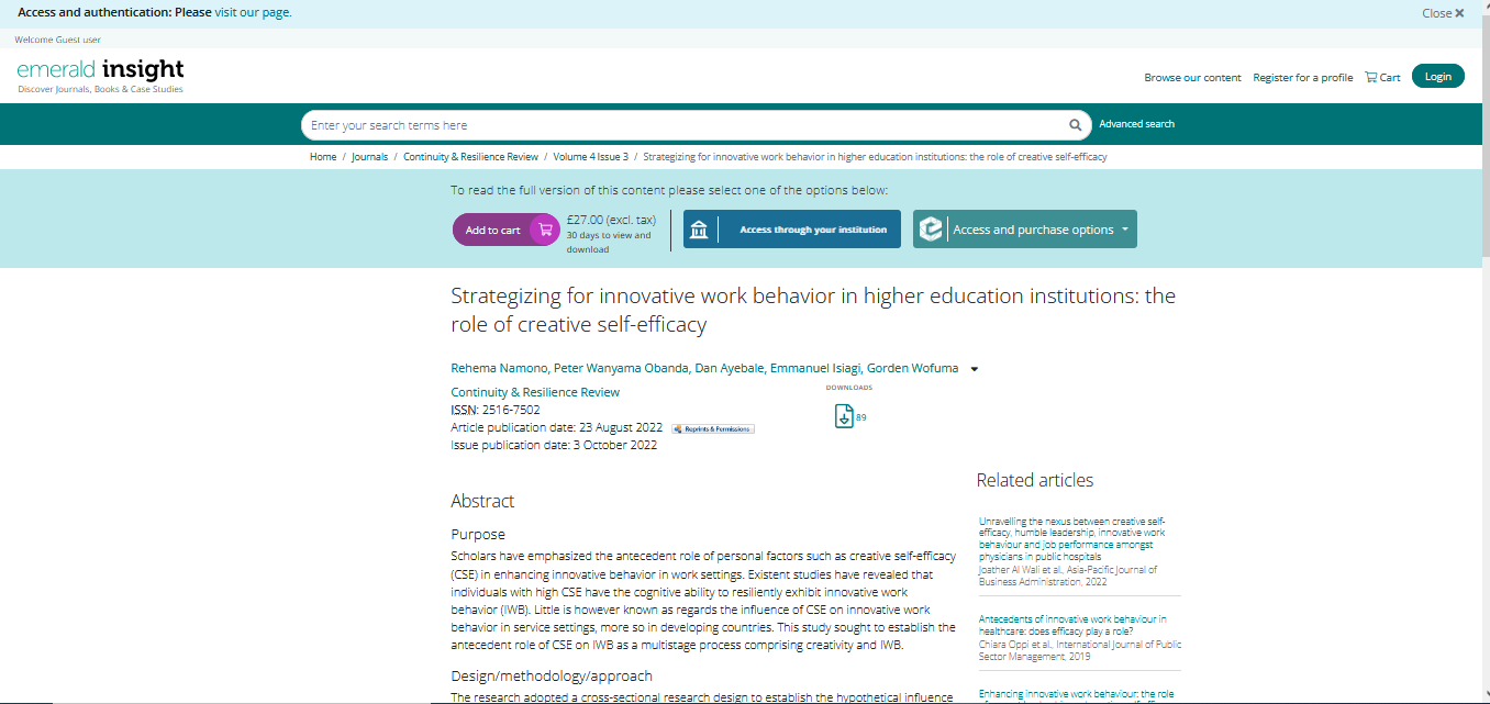 Namono, R., Obanda, P.W., Ayebale, D., Isiagi, E. and Wofuma, G. (2022), "Strategizing for innovative work behavior in higher education institutions: the role of creative self-efficacy", Continuity & Resilience Review, Vol. 4 No. 3, pp. 249-266.