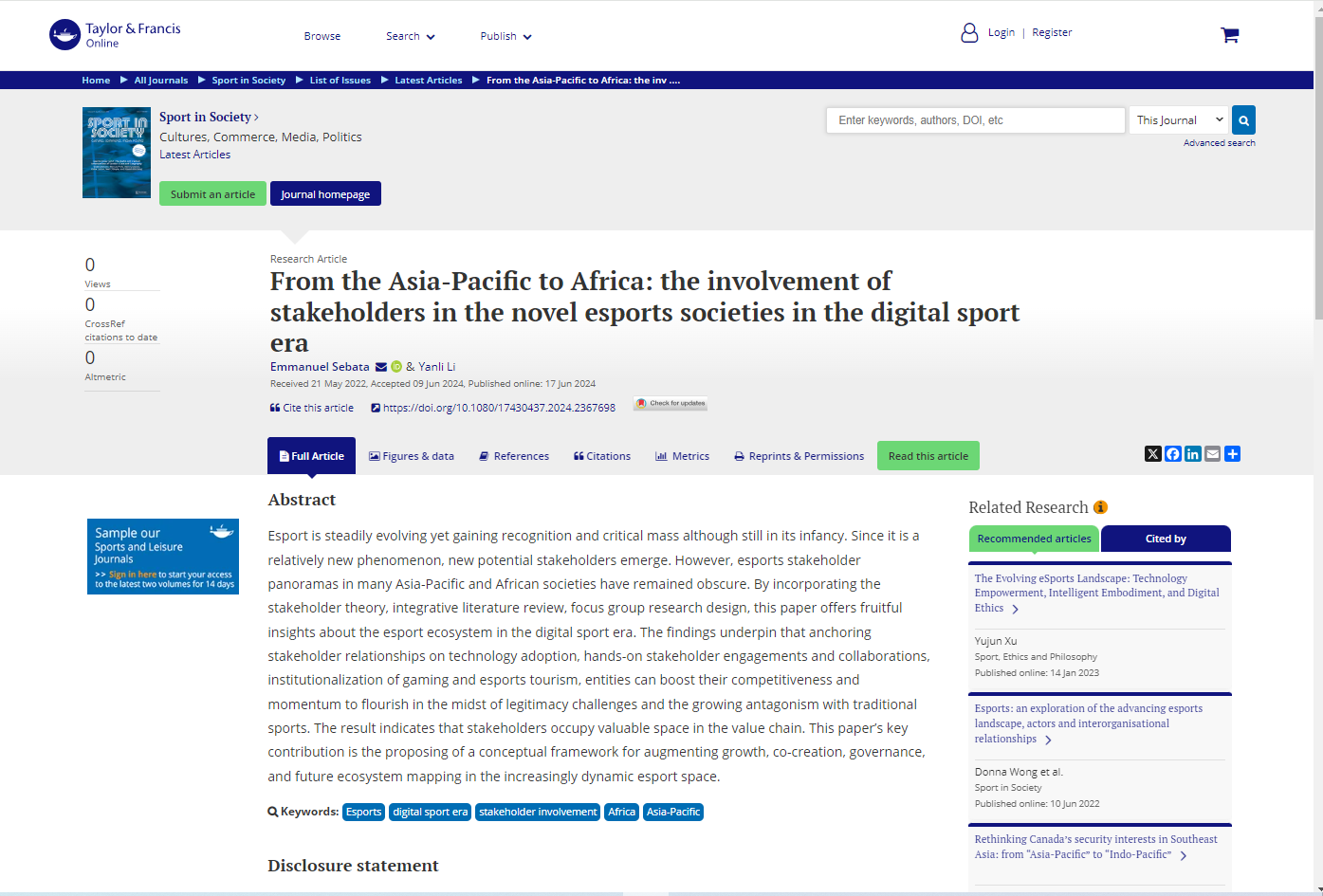 Sebata, E., & Li, Y. (2024). From the Asia-Pacific to Africa: the involvement of stakeholders in the novel esports societies in the digital sport era. Sport in Society, 1–24. https://doi.org/10.1080/17430437.2024.2367698