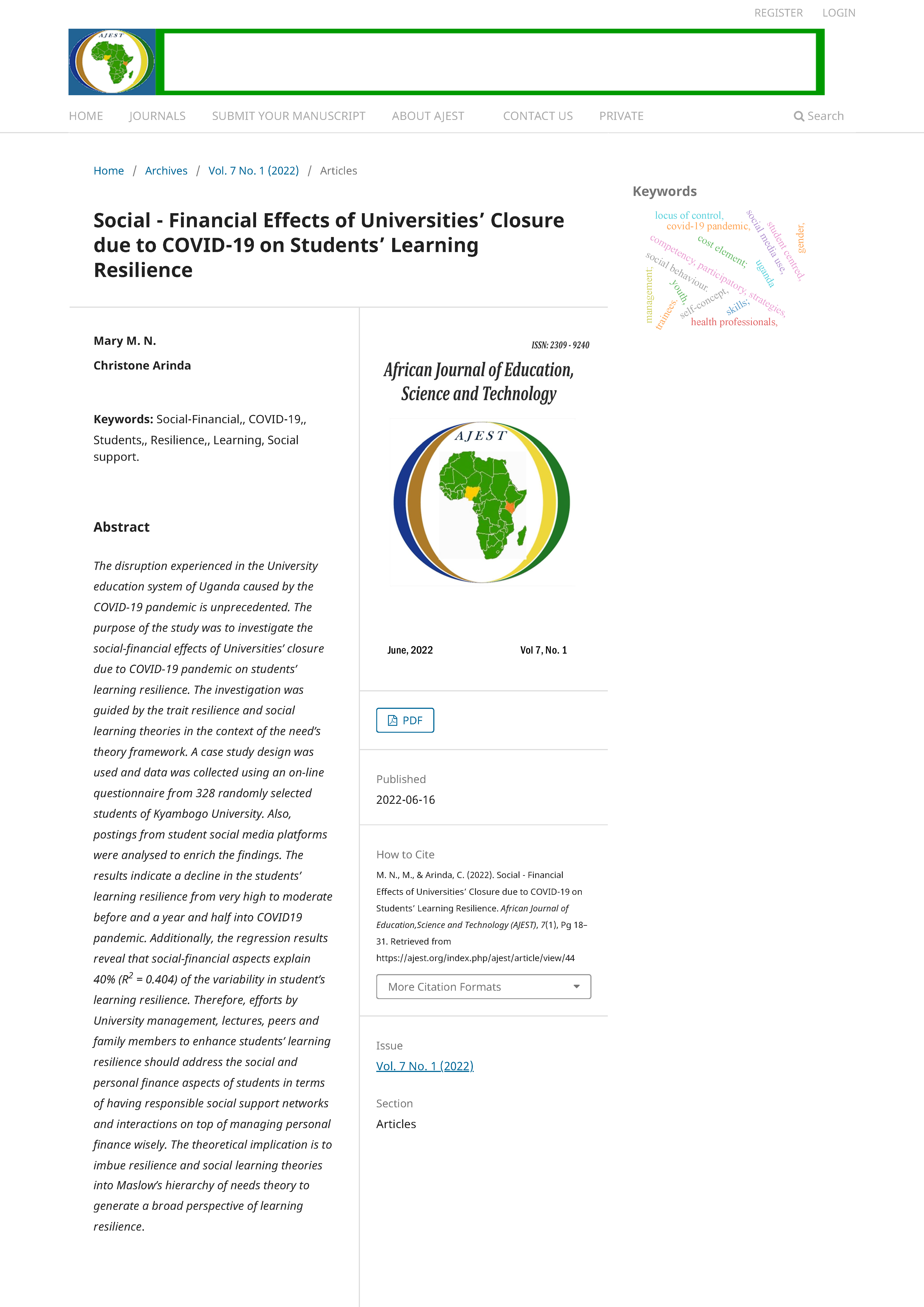 Mary, M. N., & Arinda, C. (2022). Social-Financial Effects of Universities’ Closure due to COVID-19 on Students’ Learning Resilience. African Journal of Education, Science and Technology (AJEST), 7(1), Pg-18.