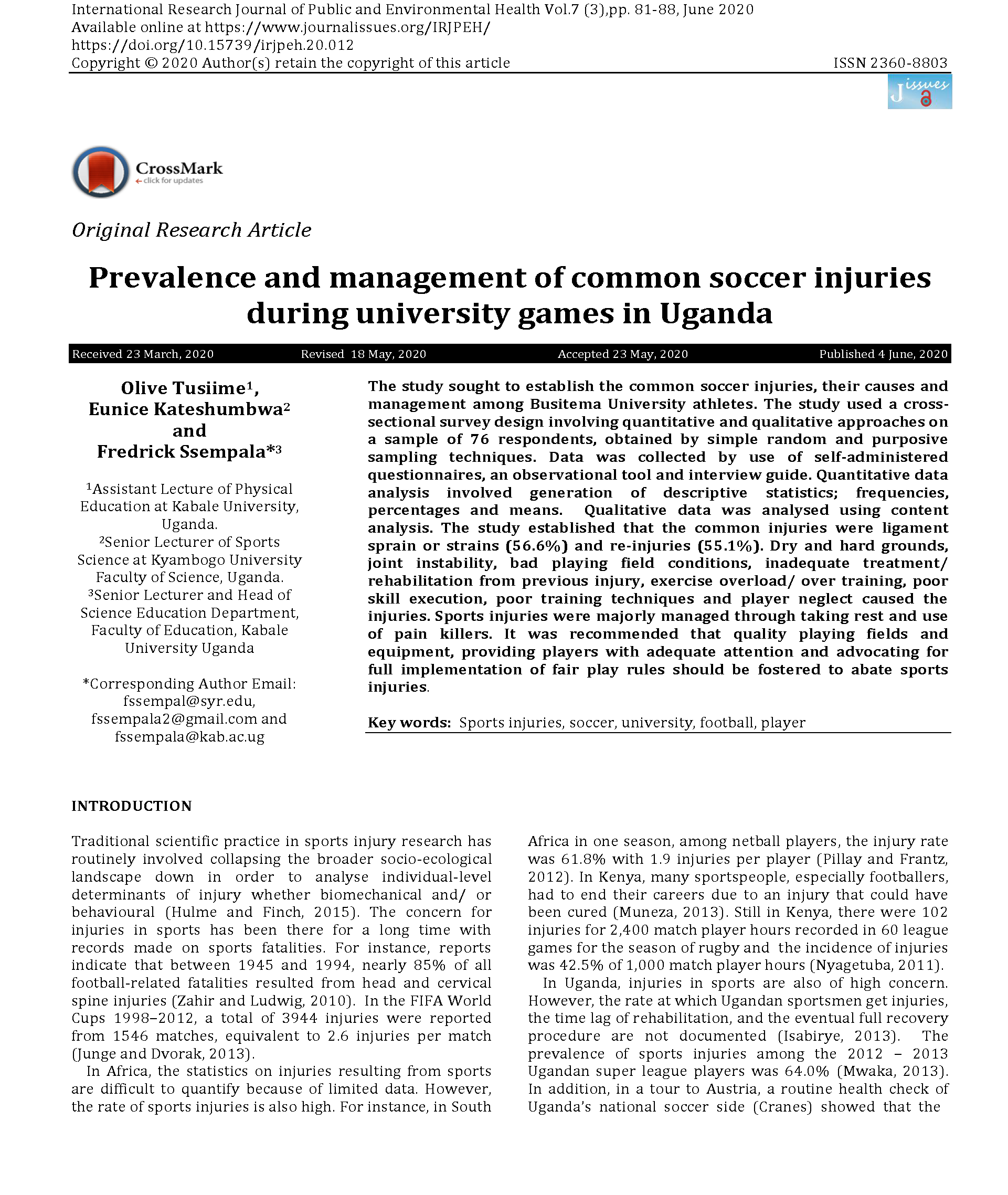 Tusiime, O., Kateshumbwa, E., & Ssempala, F. (2020). Prevalence and management of common soccer injuries during university games in Uganda. International Research Journal of Public and Environmental Health.